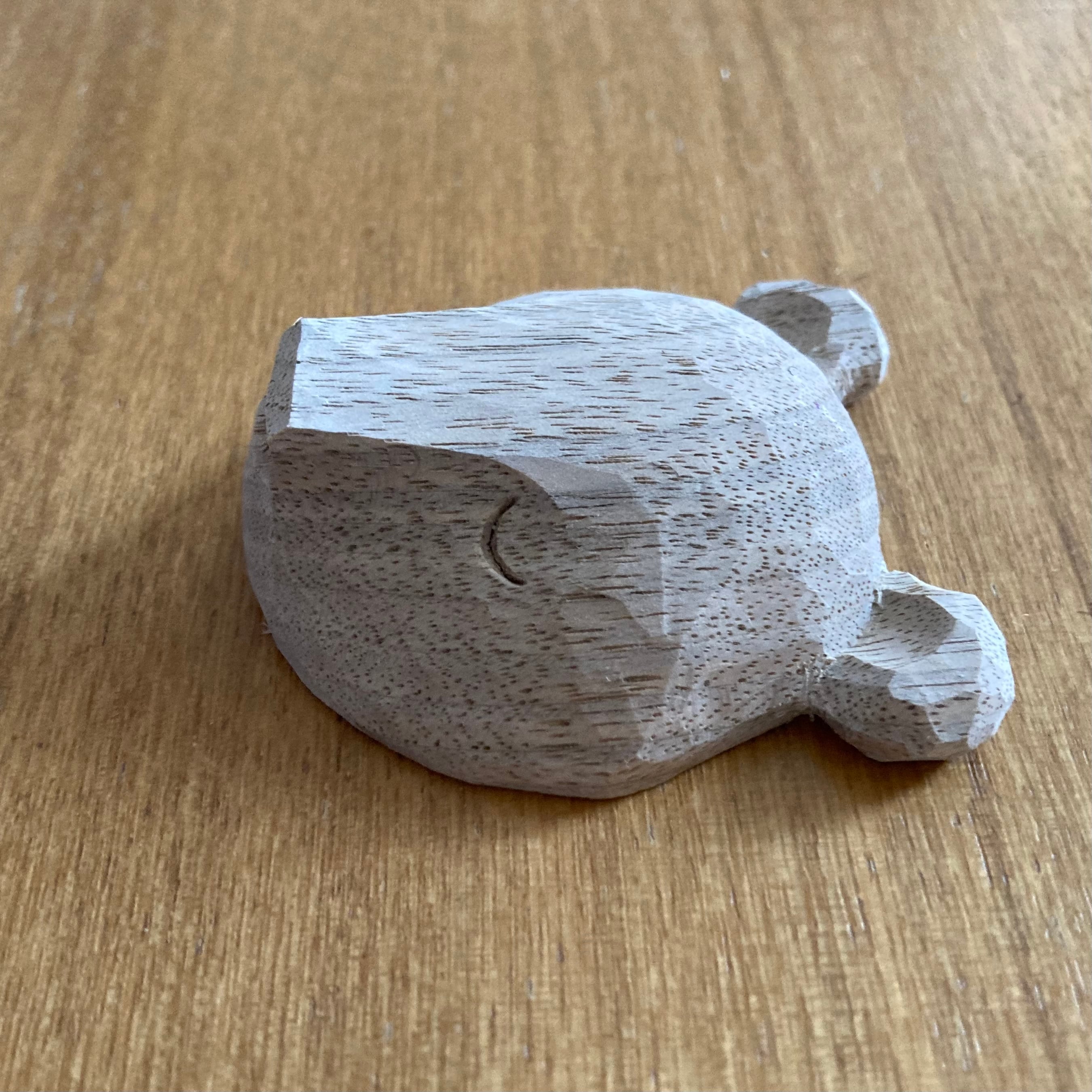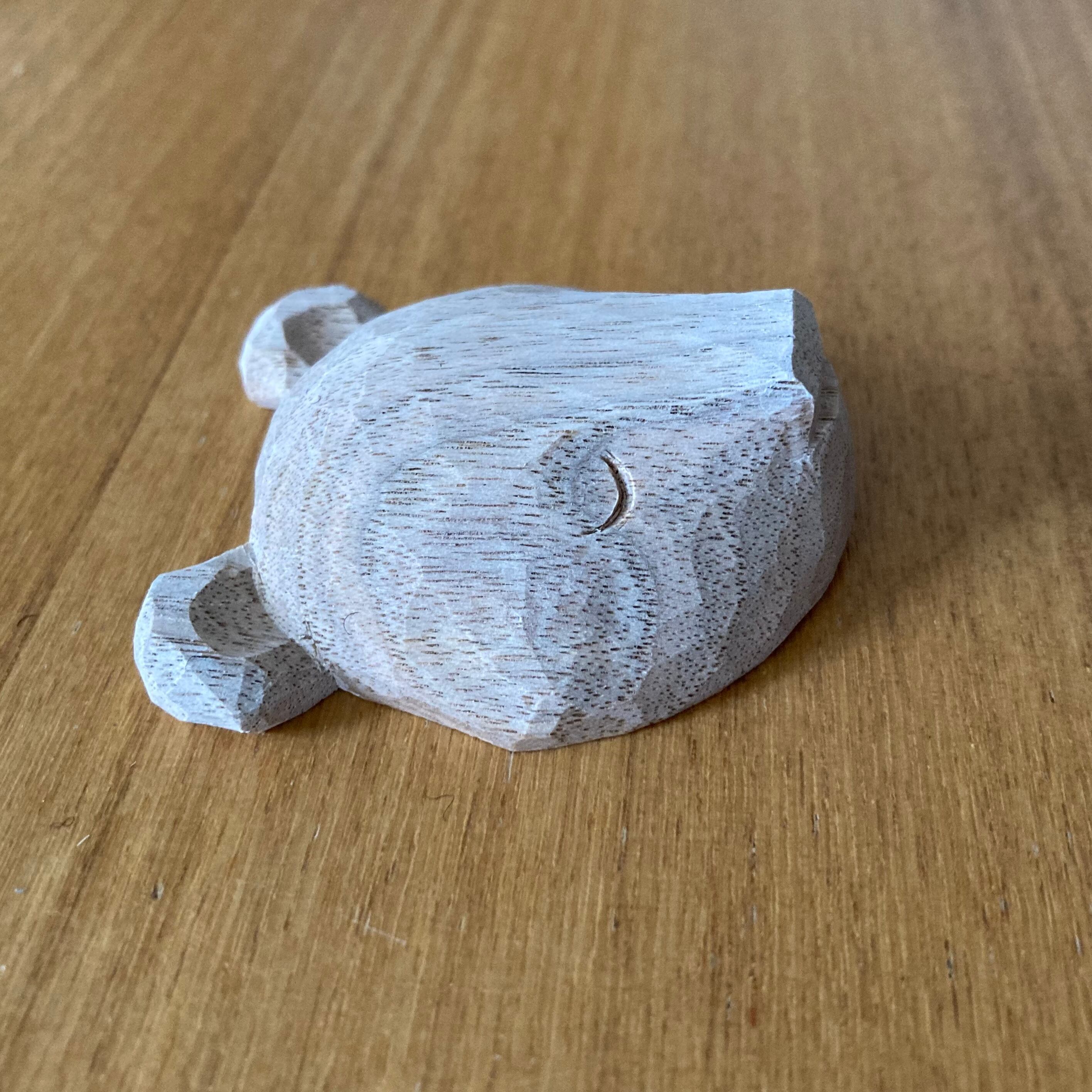 道産クルミ材で彫り上げたあと、胡粉を塗り重ねて眠気をまとっている様子を表現しました。